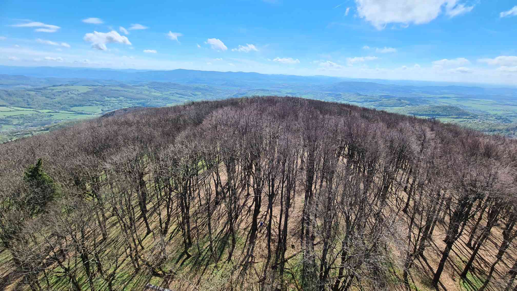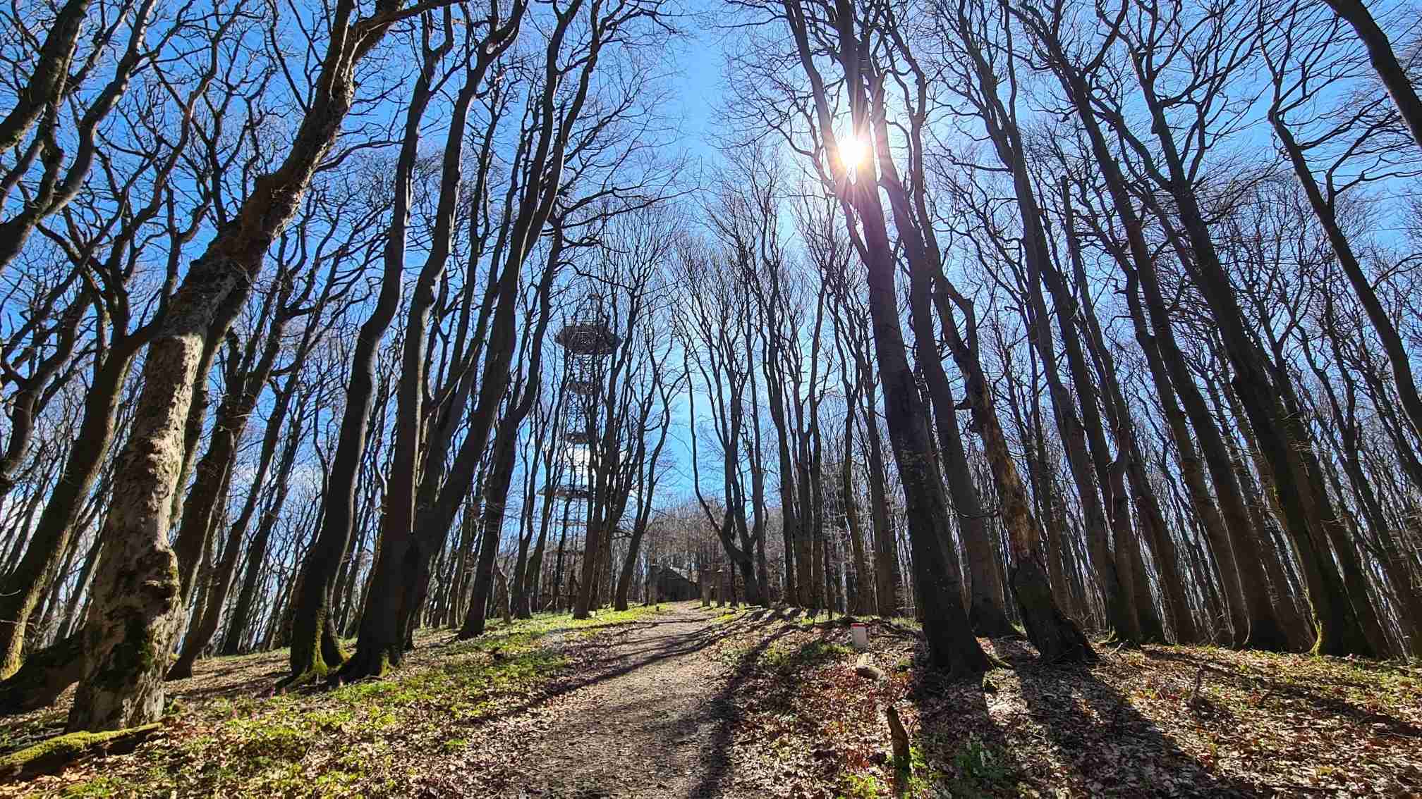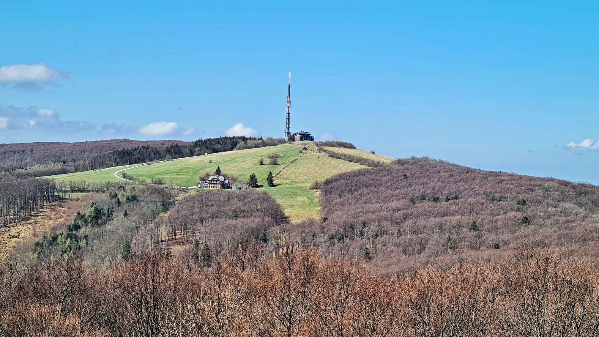 Komu je to málo, môže prejsť 2 km a 35 minút prekrásnym slnečným lesom až na Jelenec, ktorý má rovnakú nadmorskú výšku ako Chmeľová. Zelená turistická značka vedie stále po hranici a na Rázcestí Pod Jelencem bočí do Česka, ale dobre viditeľný chodník odtiaľ pokračuje rovno na Jelenec, vrch s významnou minulosťou a jej pozostatkami v polčase rozpadu. Najzaujímavejšími objektami bývalej retranslačnej stanice pre leteckú dopravu sú podzemný bunker a 48 m vysoký hrdzavý anténny stožiar. Hoci stožiar nie je turistická rozhľadňa, samozrejme, že som sa naň vydriapala a to boli výhľady! Veľká Javorina s Holubyho chatou ako na dlani, zvlnená Myjavská pahorkatina, Biele Karpaty až po Veľký Lopeník, Nové Mesto nad Váhom, Lieskovská dolina, Květná a Strání. Len keby tak nefučalo.